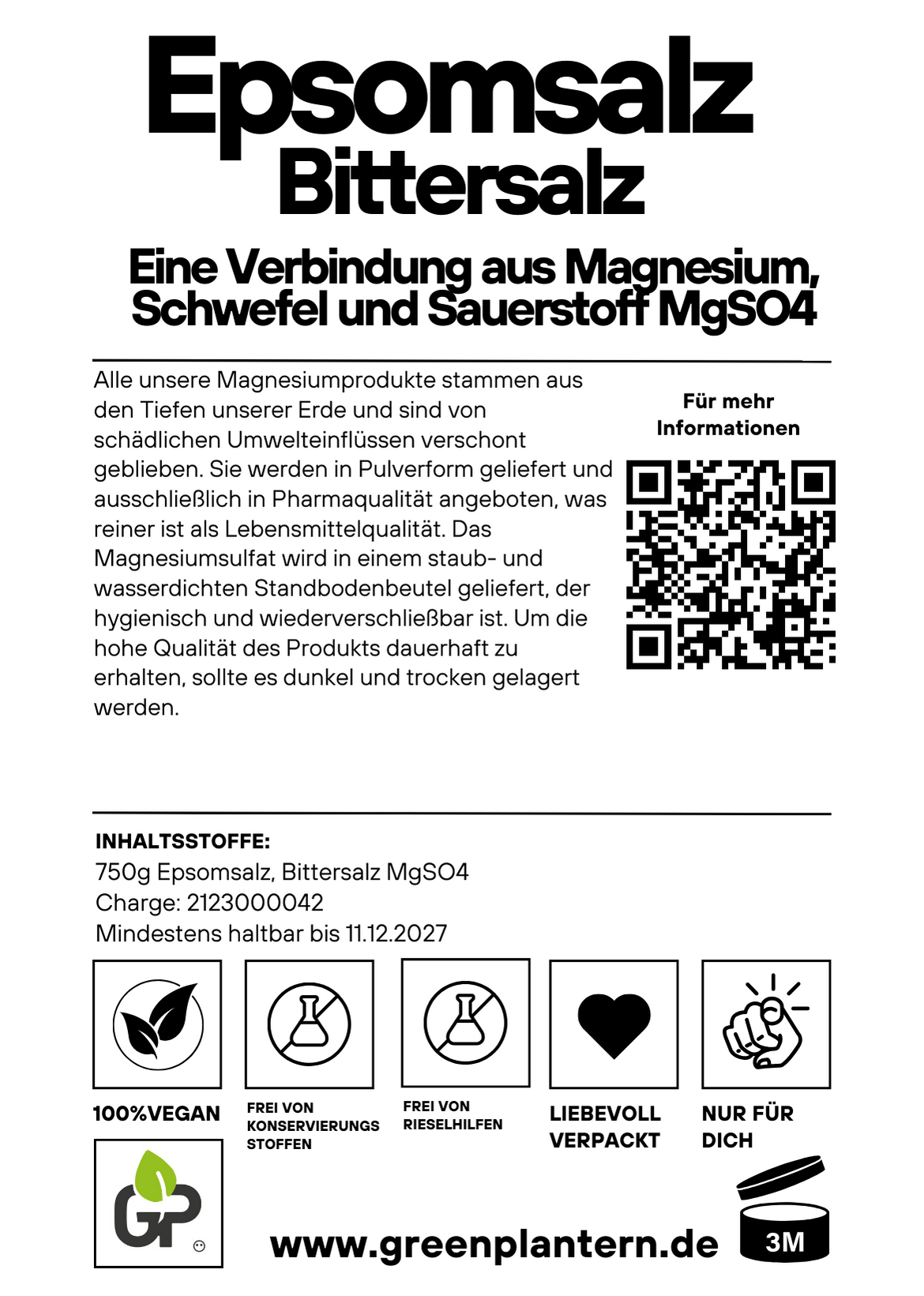 Anwendungsbereiche: Bittersalz ist ideal für die Herstellung von Magnesiumbädern und Magnesium-Fußbädern sowie für kosmetische Anwendungen geeignet. Die optimale Badezeit beträgt sowohl bei Fußbädern als auch bei Vollbädern 20-30 Minuten.